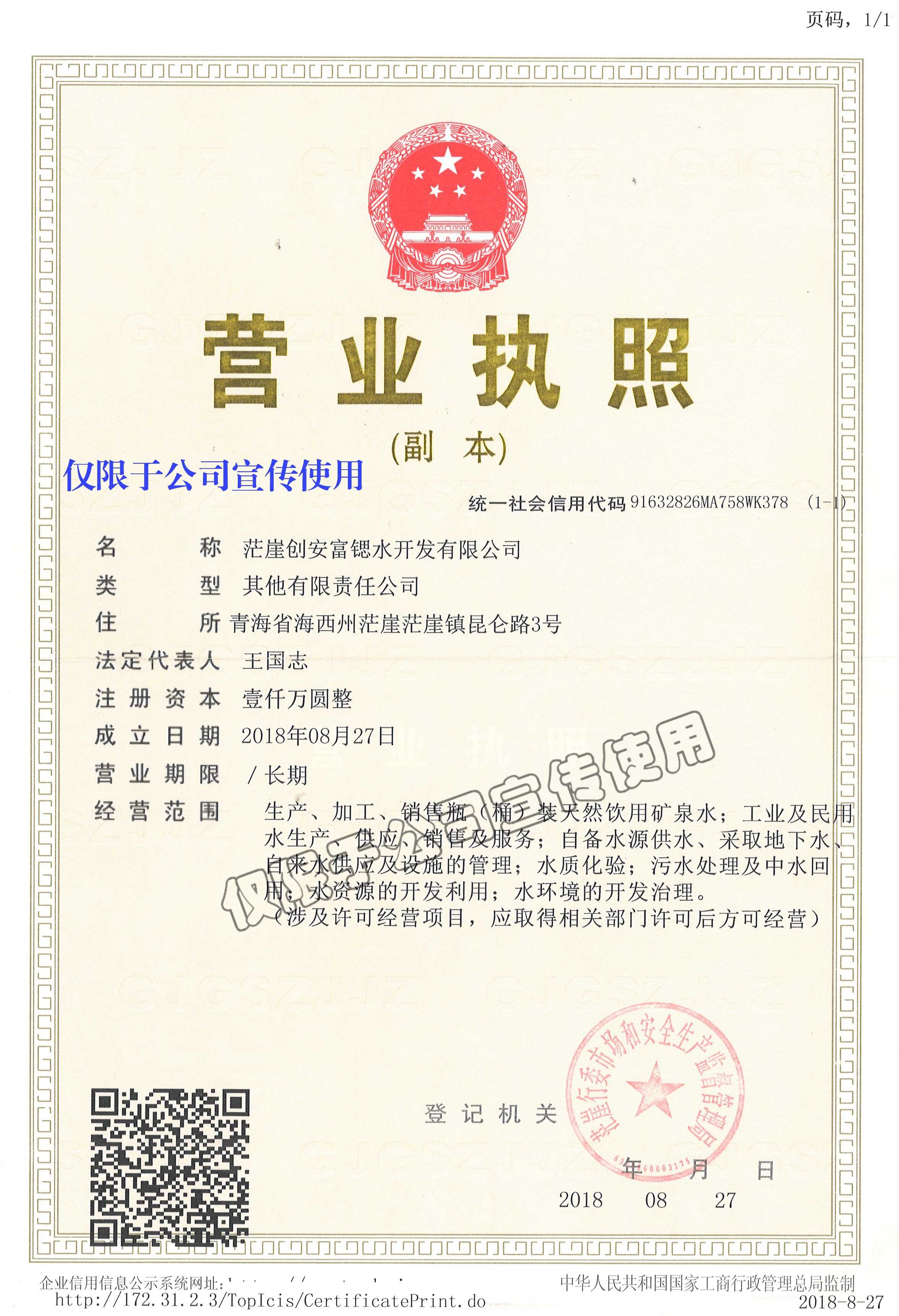 经营范围:生产、加工、销售瓶(桶)装天然饮用矿泉水;工业及民用水生产、供应、销售及服务;自备水源供水、采取地下水、自来水供应及设施的管理;水质化验;污水处理及中水回用;水资源的开发利用;水环境的开发治理。